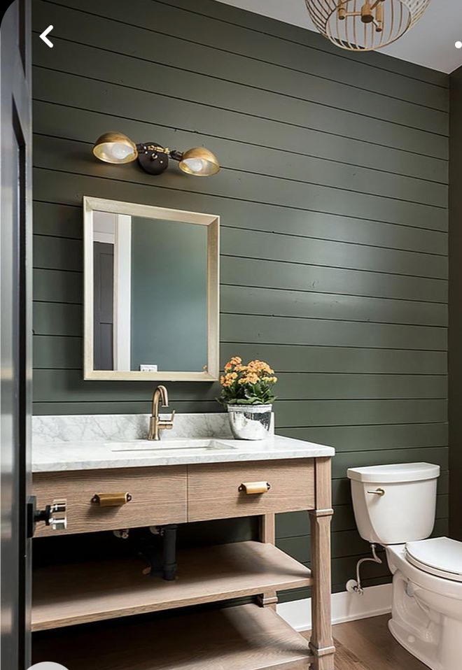 Cabinets:I then tried to find a way to work with what I currently had. The original vanity cabinets had fairly simple lines and were in good shape. Seeing that buying new ones would be a large expense, I decided to paint them and add new hardware. That way I would save money to work with in my budget for other things. Originally I had planned to shiplap the other wall, paint the floor and counter, and reframe the mirror. However, those are all details my husband is better at, and he was too busy getting our other house on the market at the time to be able to help me. We might still add those elements or save them for the full renovation.
