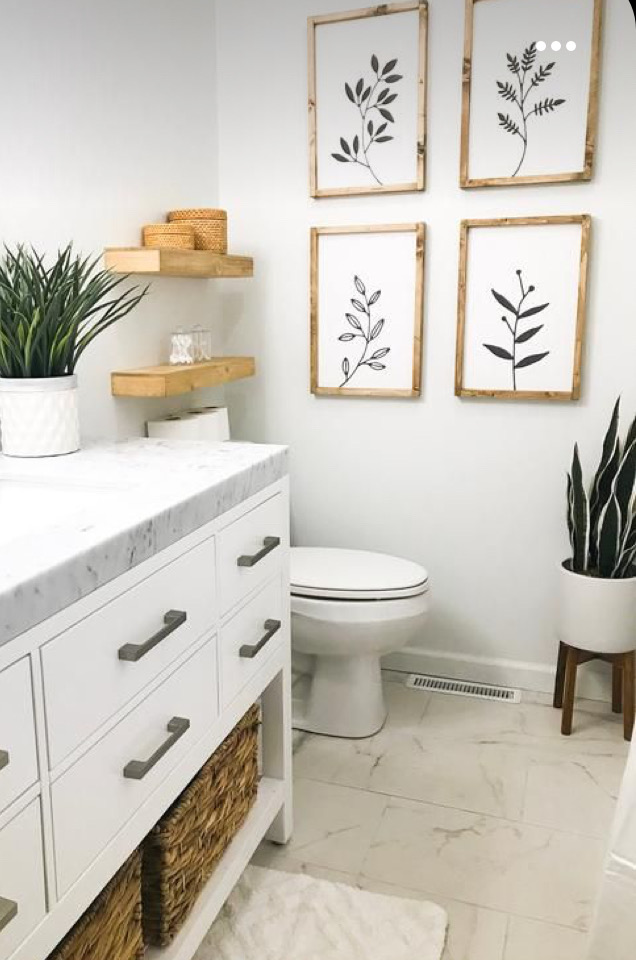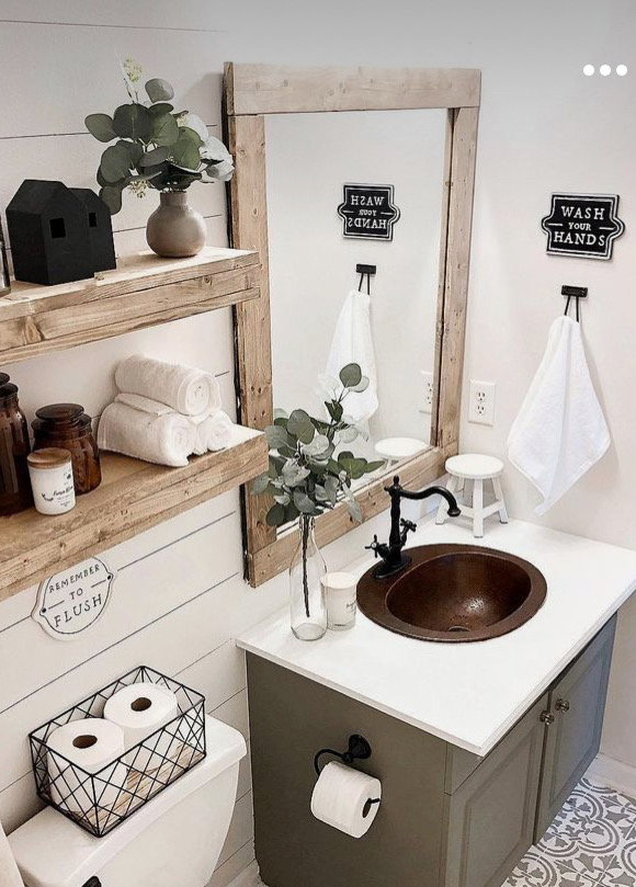 Firstly, I created a board on Pinterest with all the pics I loved of bathrooms that are a similar layout to what we have to work with. Pinning anything that struck me as beautiful and the feeling I wanted. After that I narrowed the decisions down to what I knew was staying and what I already had that I could utilize. The countertops, cabinet, and flooring were staying for sure. I also knew that I had some decor from my previous house that would work with the feel I was going for. Then I looked through my board on Pinterest to find pins I had saved that looked similar or would match with what I have.