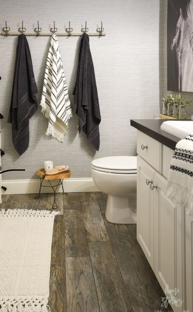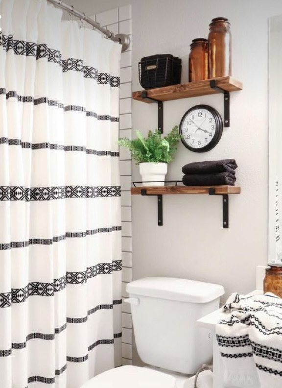 Decor items: Next, I found the exact shower curtain in my pins at Walmart and the matching towels! I loved the cream neutral color palette with the cute black boho elements, and it was very affordable. The black boho rug I purchased to cut down on washings! The darker color helps hide dirt and stains and washes up nicely! I have washed in my washing machine multiple times, and just hang it to dry.